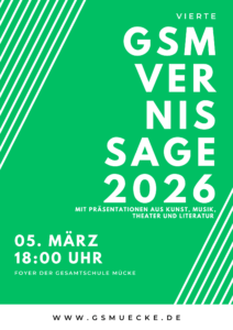 Die dritte Vernissage an der Gesamtschule knüpfte par excellence an die beiden vorherigen an. Die vielen Vorbereitungen für die unterschiedlichen Aufführungen und Projekte haben sich gelohnt. Die vielen Gäste waren begeistert, darunter Schüler, Eltern, Verwandte und weitere Interessierte. Mit dem Aufbau und dem Herrichten des Foyers hatten sich die Schülerinnen, Schüler und ein Team von Lehrkräften sehr viel Mühe gegeben. Mit Lichterketten kam eine schöne Atmosphäre auf. Die Stehtische waren mit Blumen und Kerzen geschmückt und es waren auch Stühle aufgestellt. Empfangen wurden alle Gäste mit Sekt oder Orangensaft.