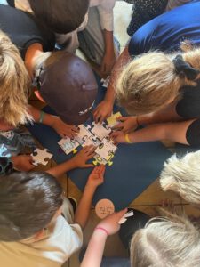 Bei bestem Wetter erkundeten die Kinder zunächst das idyllisch gelegene CVJM-Feriendorf Herbstein, bevor das offizielle Programm begann. Im Fokus stand ein sozialpädagogisches Kompetenztraining nach dem Konzept „Ich – Du – Wir“, das auf den Aufbau einer vertrauensvollen Klassengemeinschaft abzielt. Im Rahmen des Trainings beschäftigten sich die Kinder zunächst mit dem Thema „Ich“, wobei sie ihre eigenen Stärken und Gefühle reflektierten, um ein positives Selbstbild zu entwickeln. Darauf aufbauend folgte die Einheit „Ich und Du“, in der sie sich durch spielerische Übungen mit Selbst- und Fremdwahrnehmung auseinandersetzten, ihre Mitschüler besser kennenlernten und lernten, einander mit Offenheit und Akzeptanz zu begegnen. Den Abschluss bildete die Phase „Wir“, in der durch kooperative Erlebnisspiele der Teamgeist gefördert und der Zusammenhalt innerhalb der Klasse gestärkt wurde.