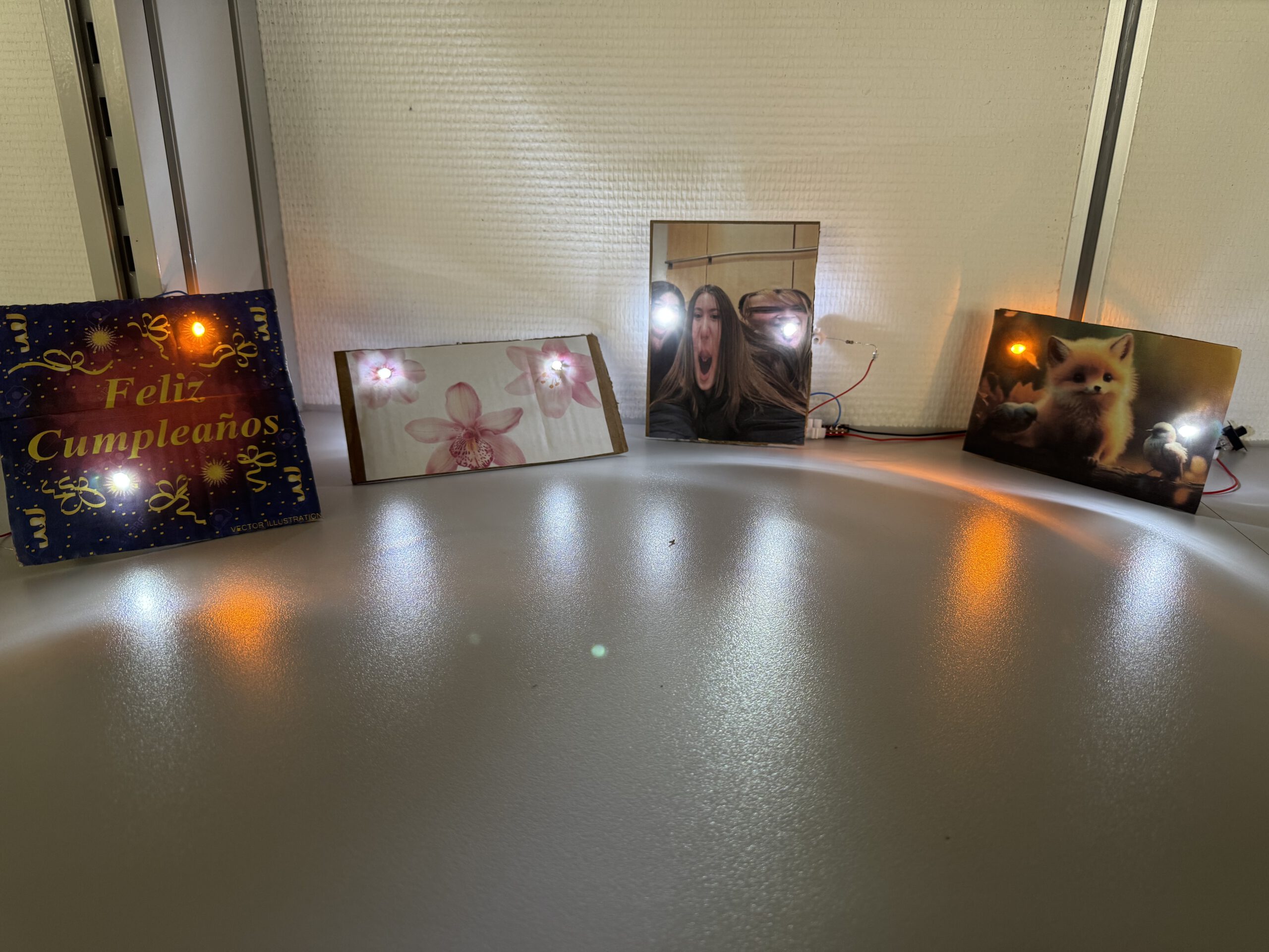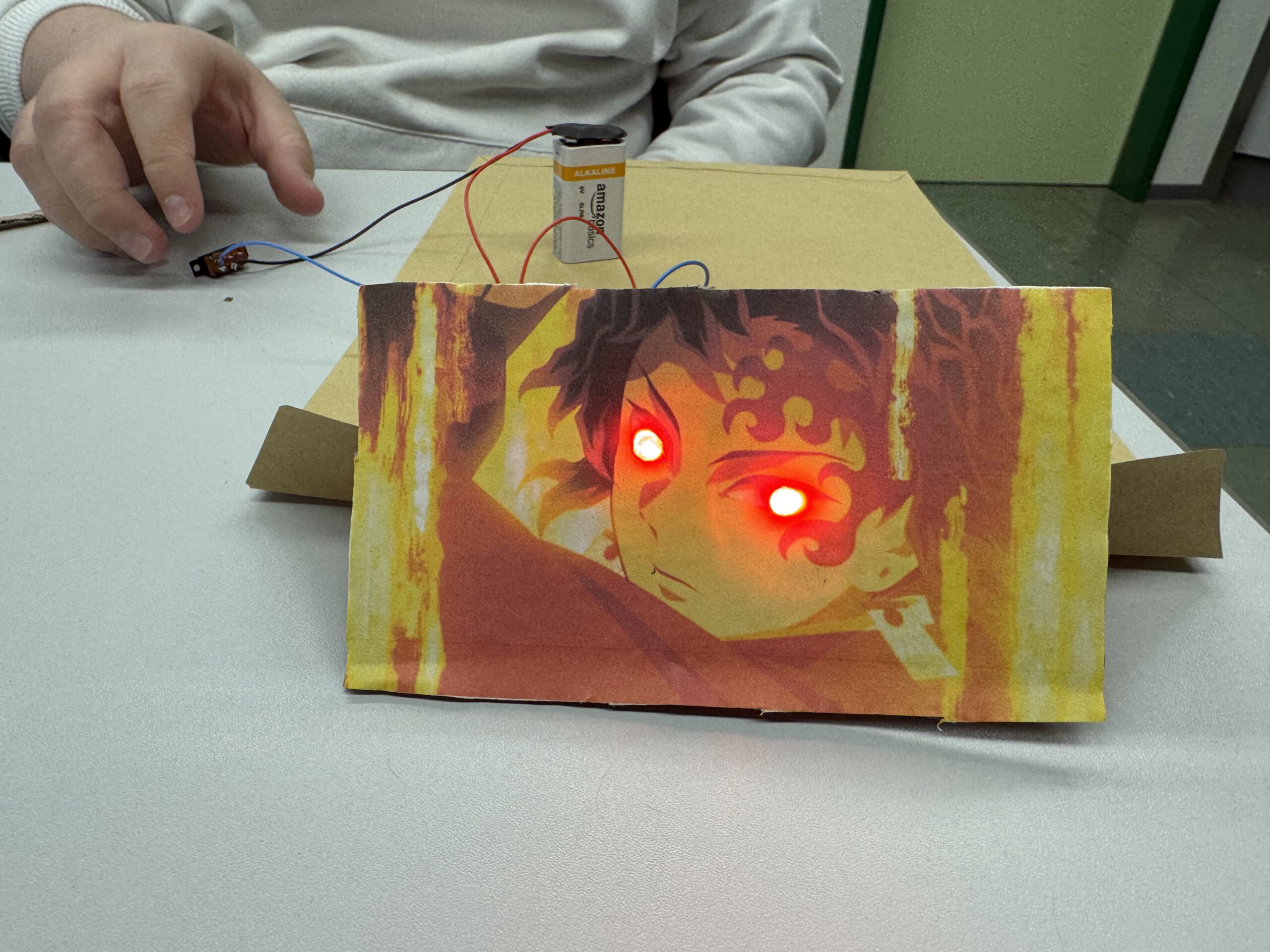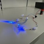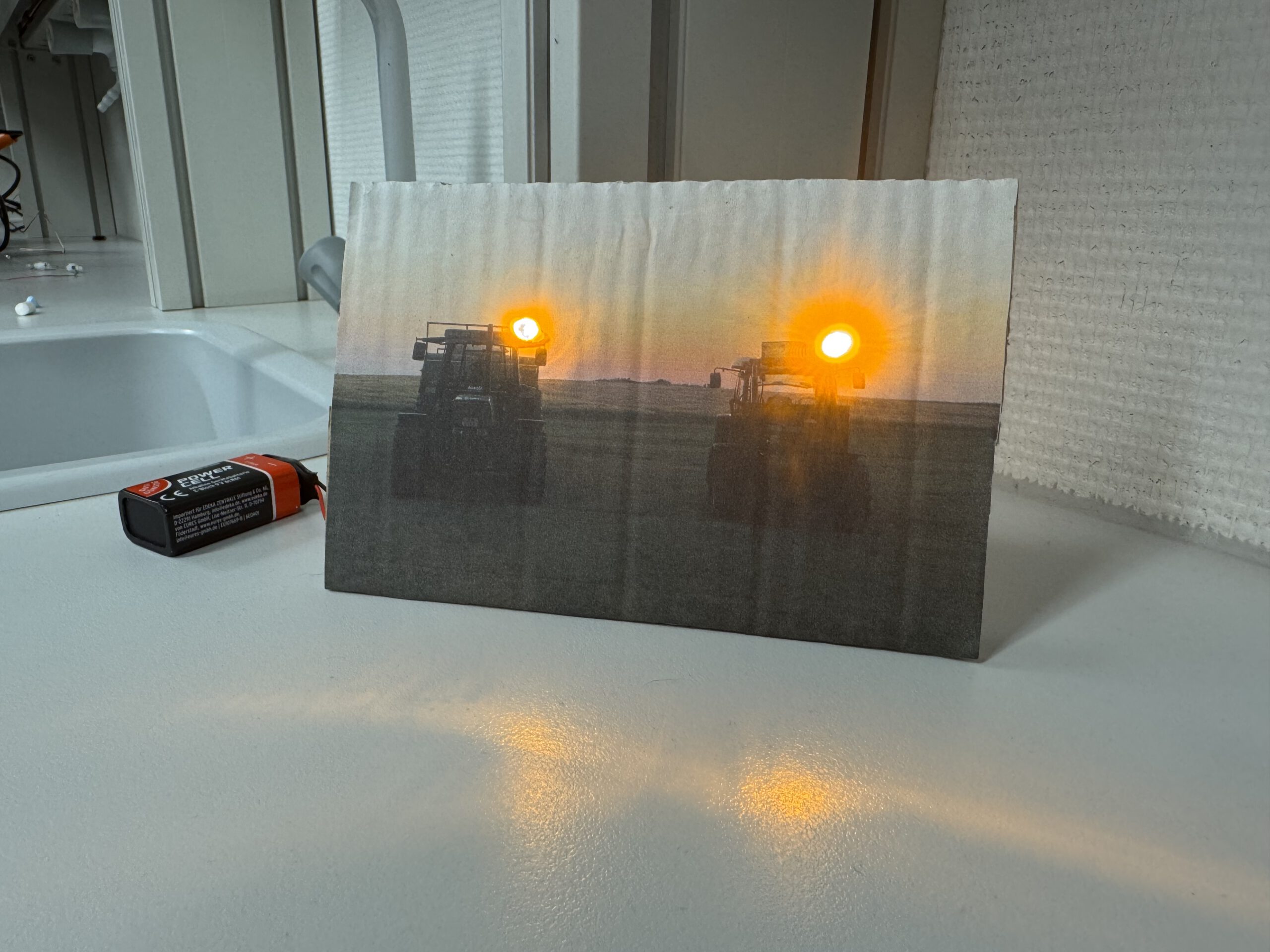Hinter einem selbst gestalteten Bild wurden LEDs an ausgewählten Stellen eingebaut und über Kabel, Vorwiderstände und einen Schalter mit einer Batterie verbunden. So entstanden individuelle Werkstücke, bei denen physikalische Zusammenhänge sichtbar und erlebbar wurden.