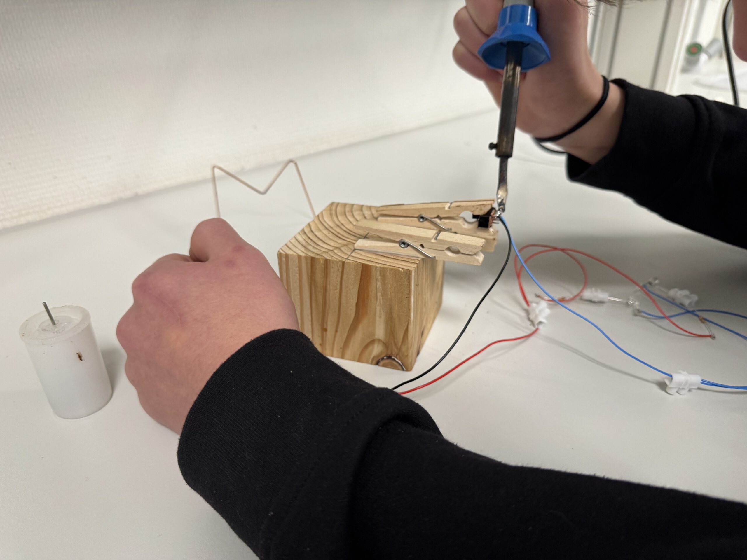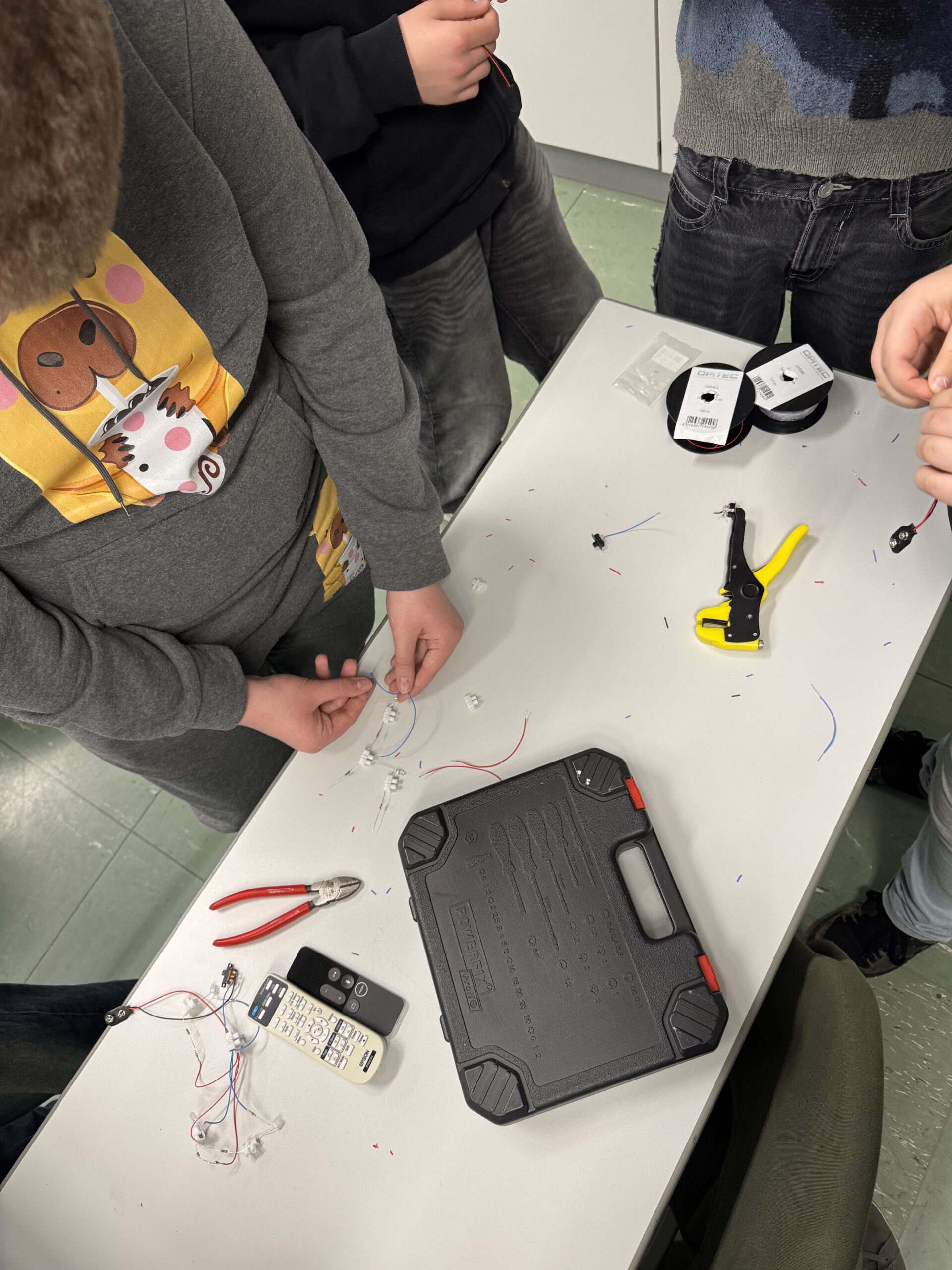 Im Anschluss setzten die Schülerinnen und Schüler dieses Wissen praktisch um. Dabei lernten sie grundlegende arbeitstechnische Fertigkeiten kennen: Kabel fachgerecht abisolieren, elektrische Verbindungen löten, sowie Stromkreise mithilfe von Lüsterklemmen sicher verbinden.