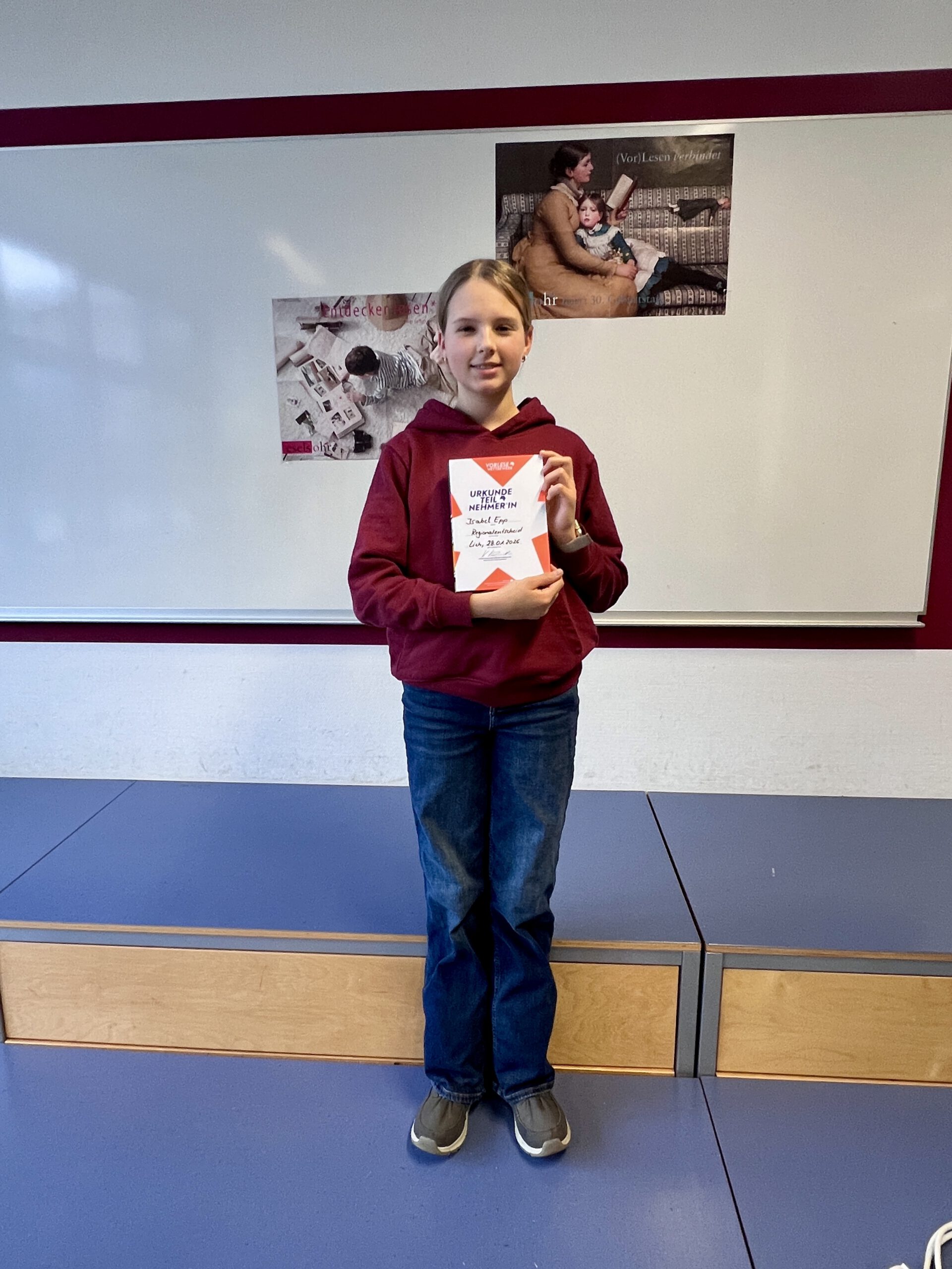 Alle teilnehmenden Schülerinnen und Schüler präsentierten ihre sorgfältig ausgewählten Texte ebenso wie den Fremdtext mit großem Engagement und überzeugenden Leseleistungen. Auch wenn es für Isabel am Ende leider nicht für ein Weiterkommen reichte, sind wir sehr stolz auf Isabels Leistung sowie auf ihren gelungenen und souveränen Auftritt. Alle Teilnehmerinnen und Teilnehmer erhielten als Anerkennung am Ende ein Buch geschenkt. Der Regionalentscheid war für alle Beteiligten ein schöner und bereichernder Nachmittag.